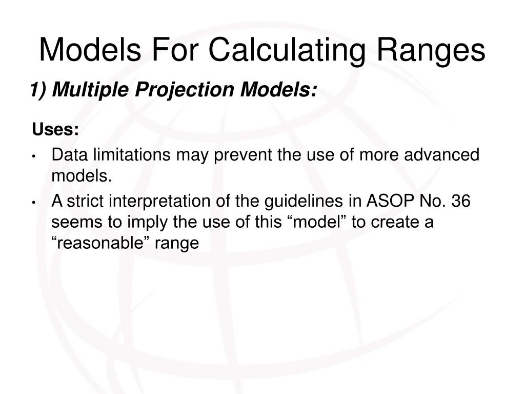 Models For Calculating Ranges 1) Multiple Projection Models: Uses: • Data limitations may prevent the use of more advanced models. • A strict interpretation of the guidelines in ASOP No. 36 seems to imply the use of this “model” to create a “reasonable” range