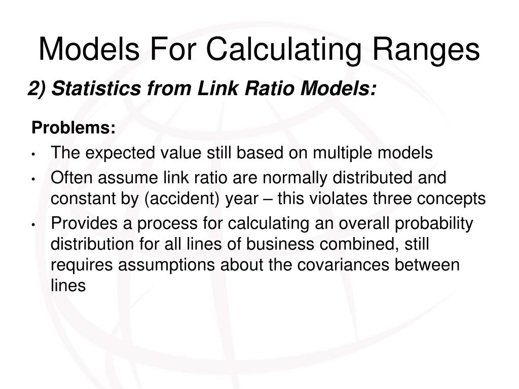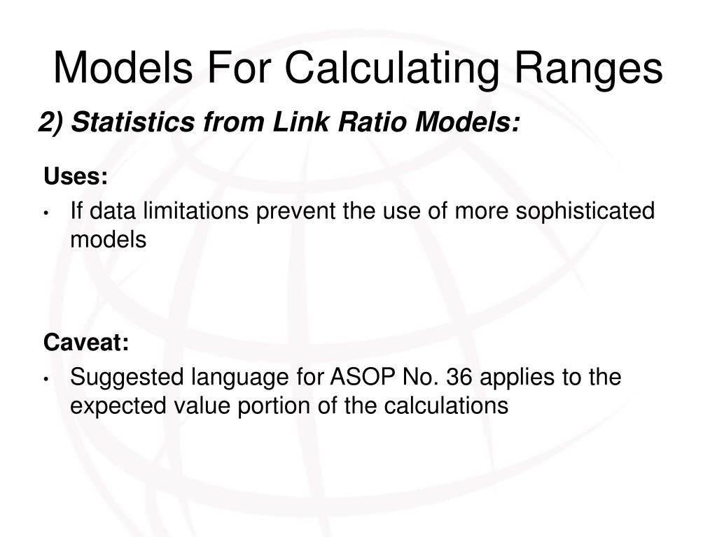 Models For Calculating Ranges 2) Statistics from Link Ratio Models: Uses: • If data limitations prevent the use of more sophisticated models Caveat: • Suggested language for ASOP No. 36 applies to the expected value portion of the calculations