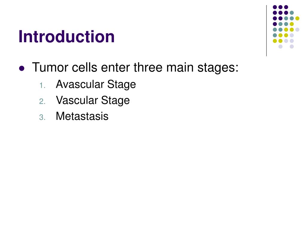 Introduction • Tumor cells enter three main stages: • Avascular Stage • Vascular Stage • Metastasis
