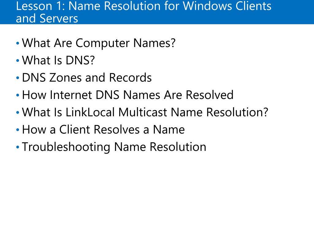 Lesson 1: Name Resolution for Windows Clients and Servers • What Are Computer Names? What Is DNS? DNS Zones and Records How Internet DNS Names Are Resolved What Is LinkLocal Multicast Name Resolution? How a Client Resolves a Name Troubleshooting Name Resolution