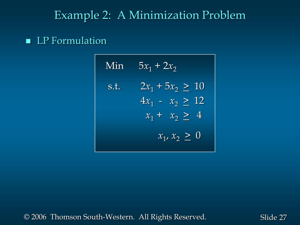 Example 2: A Minimization Problem • LP Formulation Min 5x1 + 2x2 s.t. 2x1 + 5x2> 10 4x1 - x2> 12 x1 + x2> 4 x1, x2> 0