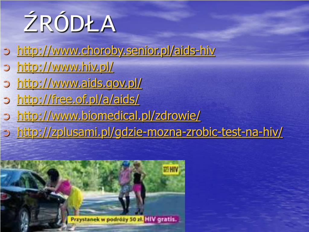 ŹRÓDŁA • http://www.choroby.senior.pl/aids-hiv • http://www.hiv.pl/ • http://www.aids.gov.pl/ • http://free.of.pl/a/aids/ • http://www.biomedical.pl/zdrowie/ • http://zplusami.pl/gdzie-mozna-zrobic-test-na-hiv/
