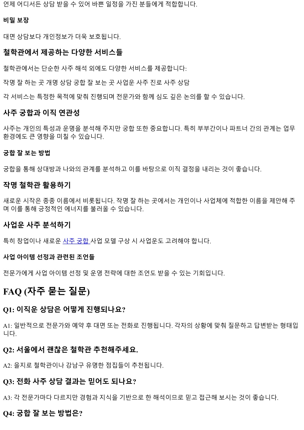 2. 언제어디서든상담받을수있어바쁜일정을가진분들에게적합합니다.언제어디서든상담받을수있어바쁜일정을가진분들에게적합합니다. 비밀보장 대면상담보다개인정보가더욱보호됩니다. 철학관에서제공하는다양한서비스들 철학관에서는단순한사주해석외에도다양한서비스를제공합니다: 작명잘하는곳개명상담궁합잘보는곳사업운사주진로사주상담 각서비스는특정한목적에맞춰진행되며전문가와함께심도깊은논의를할수있습니다. 사주궁합과이직연관성 사주는개인의특성과운명을분석해주지만궁합또한중요합니다. 특히부부간이나파트너간의관계는업무 환경에도큰영향을미칠수있습니다. 궁합잘보는방법 궁합을통해상대방과나와의관계를분석하고이를바탕으로이직결정을내리는것이좋습니다. 작명철학관활용하기 새로운시작은종종이름에서비롯됩니다. 작명잘하는곳에서는개인이나사업체에적합한이름을제안해주 며이를통해긍정적인에너지를불러올수있습니다. 사업운사주분석하기 특히창업이나새로운사주궁합사업모델구상시사업운도고려해야합니다. 사업아이템선정과관련된조언들 전문가에게사업아이템선정및운영전략에대한조언도받을수있는기회입니다. FAQ (자주묻는질문) Q1: 이직운상담은어떻게진행되나요? A1: 일반적으로전문가와예약후대면또는전화로진행됩니다. 각자의상황에맞춰질문하고답변받는형태입 니다. Q2: 서울에서괜찮은철학관추천해주세요. A2: 을지로철학관이나강남구유명한점집들이추천됩니다. Q3: 전화사주상담결과는믿어도되나요? A3: 각전문가마다다르지만경험과지식을기반으로한해석이므로믿고접근해보시는것이좋습니다. Q4: 궁합잘보는방법은?