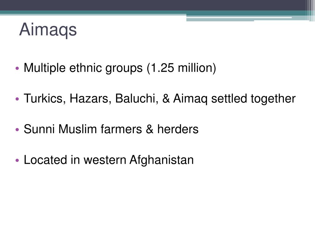 Multiple ethnic groups (1.25 million) • Turkics, Hazars, Baluchi, & Aimaq settled together • Sunni Muslim farmers & herders • Located in western Afghanistan Aimaqs