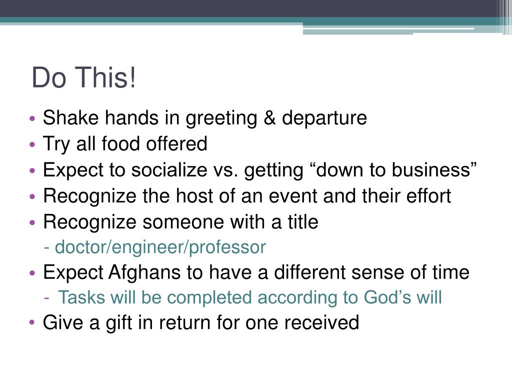 Shake hands in greeting & departure • Try all food offered • Expect to socialize vs. getting “down to business” • Recognize the host of an event and their effort • Recognize someone with a title - doctor/engineer/professor • Expect Afghans to have a different sense of time • Tasks will be completed according to God’s will • Give a gift in return for one received Do This!
