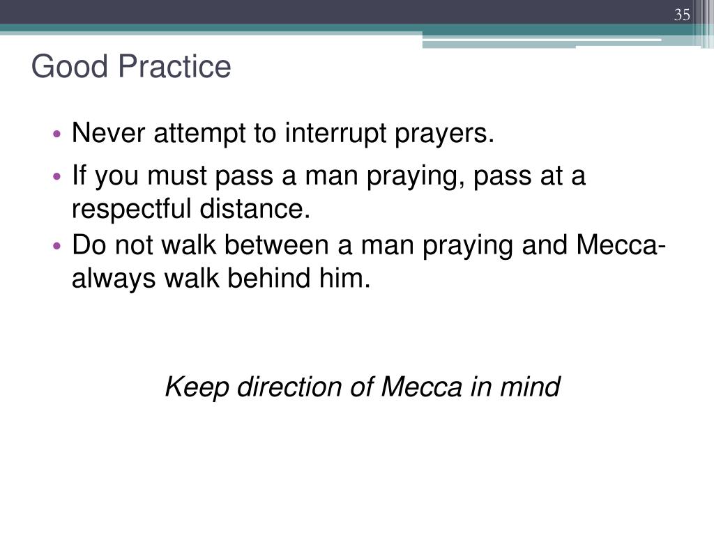 Good Practice • Never attempt to interrupt prayers. • If you must pass a man praying, pass at a respectful distance. • Do not walk between a man praying and Mecca-always walk behind him. Keep direction of Mecca in mind