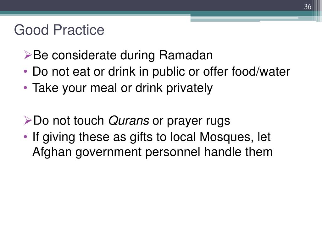 Good Practice • Be considerate during Ramadan • Do not eat or drink in public or offer food/water • Take your meal or drink privately • Do not touch Qurans or prayer rugs • If giving these as gifts to local Mosques, let Afghan government personnel handle them