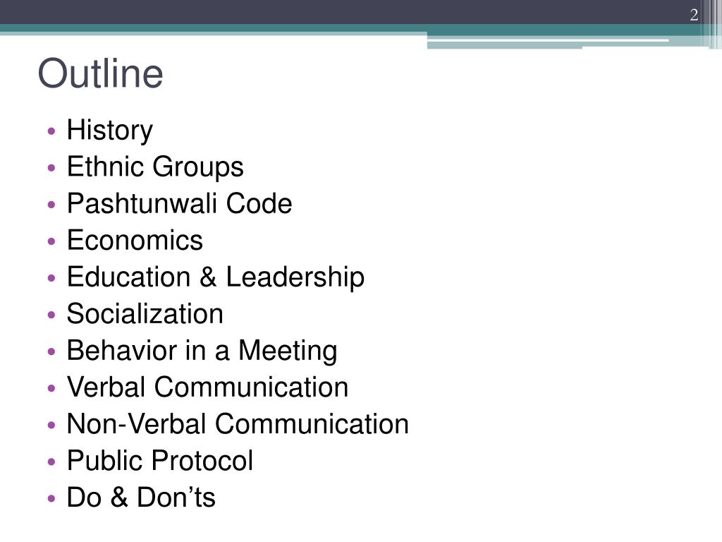 History Ethnic Groups Pashtunwali Code Economics Education & Leadership Socialization Behaviorin a Meeting Verbal Communication Non-Verbal Communication Public Protocol Do & Don’ts Outline