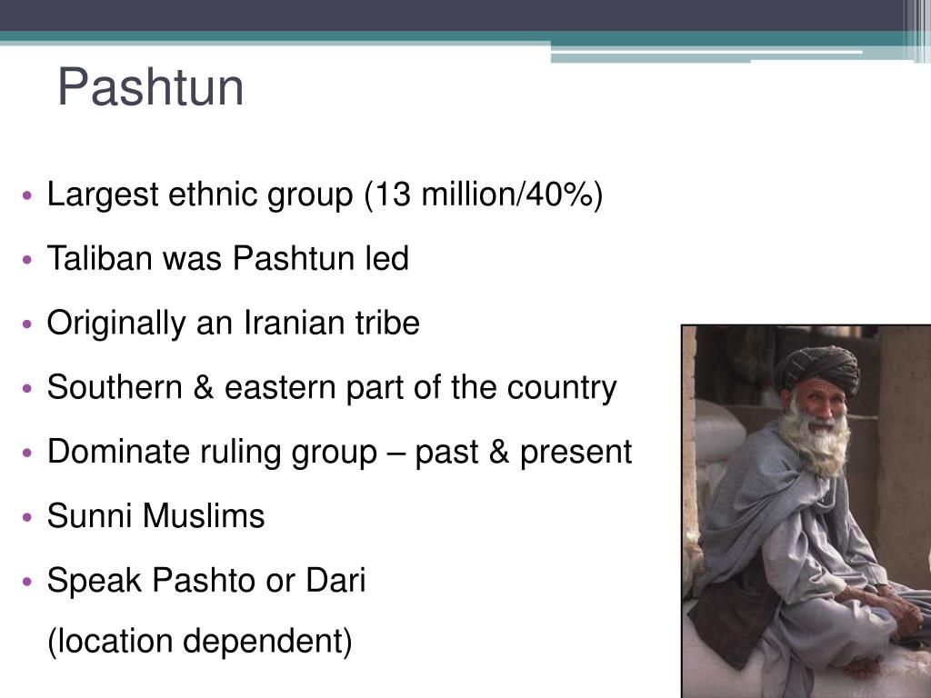 Largest ethnic group (13 million/40%) • Taliban was Pashtun led • Originally an Iranian tribe • Southern & eastern part of the country • Dominate ruling group – past & present • Sunni Muslims • Speak Pashto or Dari (location dependent) Pashtun