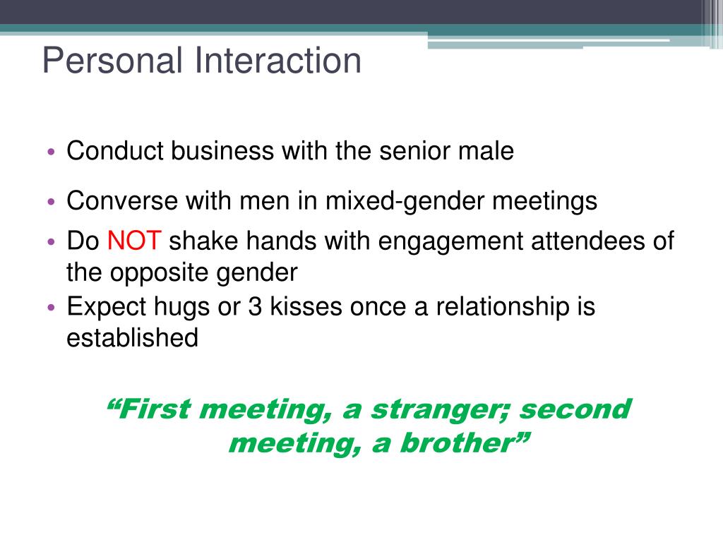 Personal Interaction • Conduct business with the senior male • Converse with men in mixed-gender meetings • Do NOT shake hands with engagement attendees of the opposite gender • Expect hugs or 3 kisses once a relationship is established “First meeting, a stranger; second meeting, a brother”