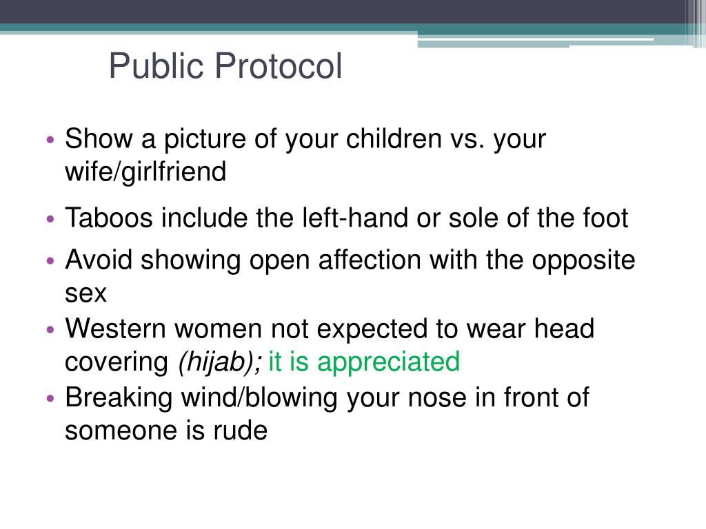 Public Protocol • Show a picture of your children vs. your wife/girlfriend • Taboos include the left-hand or sole of the foot • Avoid showing open affection with the opposite sex • Western women not expected to wear head covering (hijab); it is appreciated • Breaking wind/blowing your nose in front of someone is rude