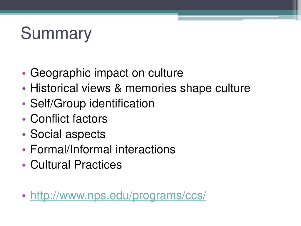 Geographic impact on culture • Historical views & memories shape culture • Self/Group identification • Conflict factors • Social aspects • Formal/Informal interactions • Cultural Practices • http://www.nps.edu/programs/ccs/ Summary