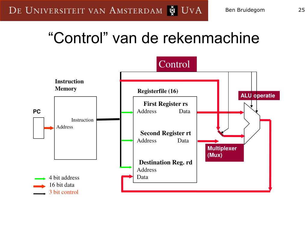 First Register rs Address Data Second Register rt Address Data Destination Reg. rd Address Data “Control” van de rekenmachine Control Instruction Memory Registerfile (16) ALU operatie PC Instruction Address Multiplexer (Mux) 4 bit address 16 bit data 3 bit control