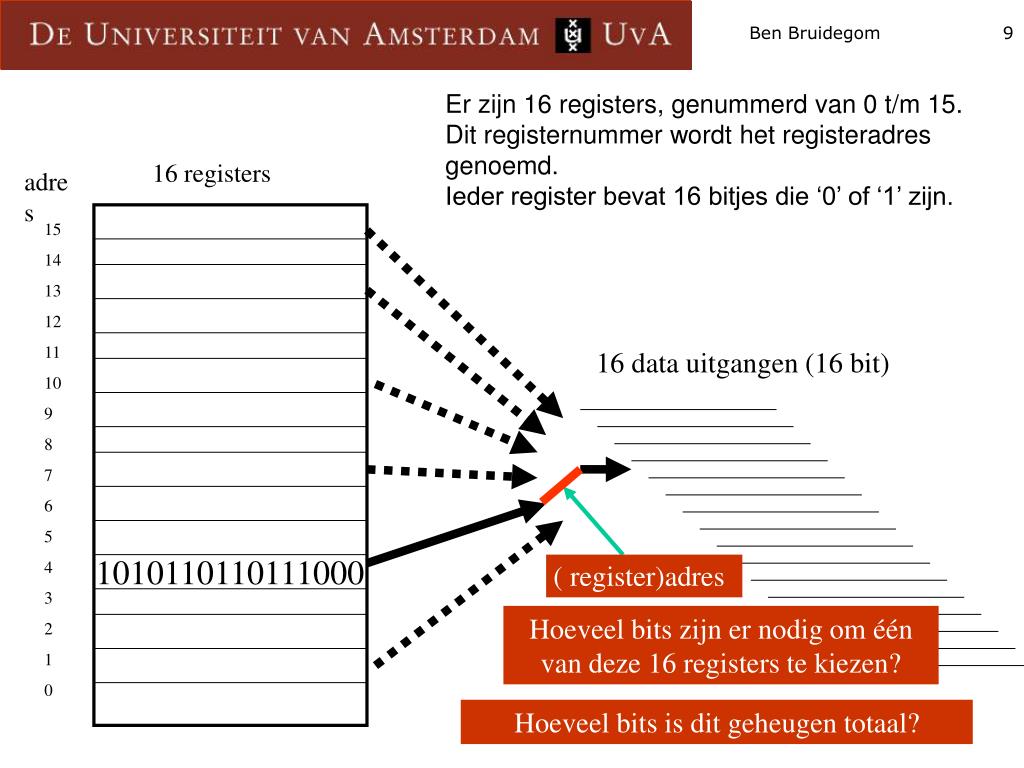 Er zijn 16 registers, genummerd van 0 t/m 15. Dit registernummer wordt het registeradres genoemd.Ieder register bevat 16 bitjes die ‘0’ of ‘1’ zijn. 16 registers adres 15 14 13 12 11 10 9 8 7 6 5 4 3 2 1 0 16 data uitgangen (16 bit) 1010110110111000 ( register)adres Hoeveel bits zijn er nodig om één van deze 16 registers te kiezen? Hoeveel bits is dit geheugen totaal?