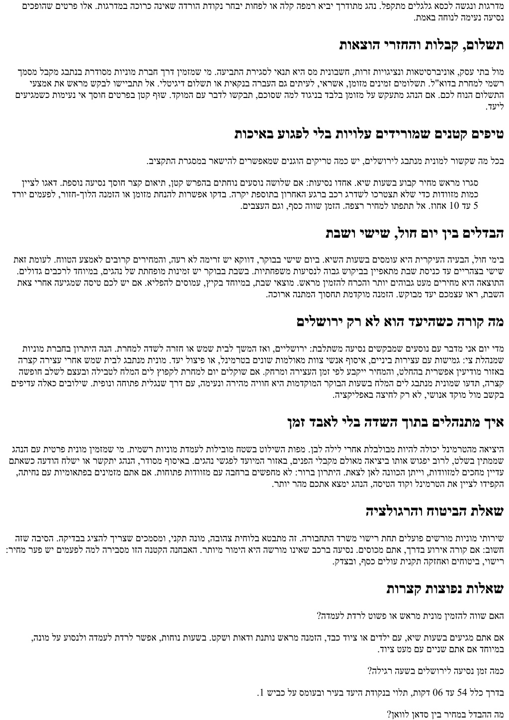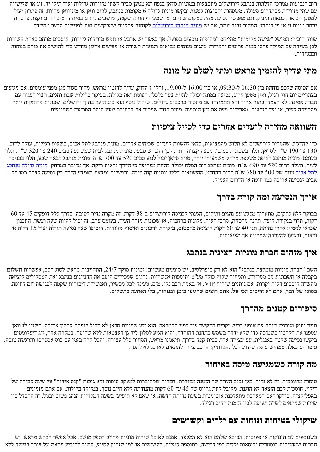 תועש יפל תינכדע בצמ תנומת - הריבל הפועתה רהנמ העיסנ הלוע תמאב המכ אל םיפירעתו תויצקילפא ,תונמזה ,םיווק םע ךבתסהל אוה םיצורש ןורחאה רבדה ,הכורא הסיט ירחא .םילשורי :רורב דעי םע גבתנב םיתחונ םיבר .םילשוריל גבתנמ תינומ איה רתויב הרישיהו הטושפה ךרדהש ןוחטיבב רמול רשפא ,םירייתו םיקסע ,םיעסונ יווילב םינש לש ןויסינמ .םירורב ריחמב שארמ הנמזהל הנומ ןיב הריחב םגו ,ןעטמ רובע תופסות ,בכרה גוס ,העונת יסמוע ,םויב העשהמ עפשומ אוה .עובק דימת אל ריחמה ,ןיידעו ןיב רדס תושעל ךיאו ,ןוכסיחל םיפיט ,תוינומה יגוס ןיב םילדבה ,םויה תועש יפל תורעושמה תויולעה לש הריהב הנומת ואצמת הזה ךירדמב .עובק .תוחונ בירקהל ילב גבתנ תוינומ לש תויורשפאה לכ ןמז תונולח יפל םיריחמ לש םייתואיצמ םיחווט הקלח המירז לש תורופס תוקדמ תונתשהל לוכי 1 שיבכ :הטושפ הביסה .תיסחי בחר חווטב ללכ ךרדב םיענ םילשוריל הפועתה רהנמ תינומ יריחמ םיגציימש ריחמ יחווט ןלהל .תונוע יפל שוקיב ילדבה םגו ,םיגחו עובש ףוס תופסות ,הליל יפירעת םימייק ףסונב .תפסונ העש יצח באושש קקפל .ינויגה העונת בחרמ ללוכ ,חטשב תינכדע תואיצמ גבתנב תומוקמ 6 הלודג תינומ .ח"ש 340 דע 280 ךרעב הלעת הליגר ןאדס תינומ .הבוט המירז בורל :07:00 דע 05:00 ,תומדקומ רקוב תועש .שארמ םואיתו דויצ תומכב יולת ,ח"ש 470 דע 380 ביבס רחמותת ,ח"ש 400 דע 320-ל בורל ץפוק ןאדסל ריחמ .1 שיבכל היילעב ןהו גבתנמ האיציב ןה םירכינ םיסמוע :10:00 דע 07:00 ,רקוב איש תועש .ח"ש 520 דע 420 - ןאוו וא חוורמ בכר .יופצ אל בוכיע שי םא רבעמ טעמ ספטי םיתעלו םיריית .ח"ש 490 דע 400 :הלודג תינומ וא ןאוו .ח"ש 360 דע 300 :ןאדס .םיככרתמ סמועה יאיש :16:00 דע 10:00 ,םיירהצ רחא דע םיירהצ .תיסחי חונ הזה ןולחה תא םיאצומ תויטנלטא-סנרט תוסיטב םיעיגמש םידחוימ םיעוריא לש םימיב .ח"ש 540 דע 440 :ןאוו ,ח"ש 420 דע 330 :ןאדס .םייתועמשמ םיסמועל הרזח :19:30 דע 16:00 ,ברע איש תועש .ח"ש 40 דע 20 דועב תולעל םילוכי םיחווטה ,זכרמה רוזאב ןובשחב וחק ,1 שיבכב הליל תודובע שי םא .ח"ש 480 דע 400 :ןאוו ,ח"ש 360 דע 300 :ןאדס .רתוי לק בורל :23:00 דע 19:30 ,ליגר הליל .םיירשפא םיבוכיע 560 דע 460 :הלודג תינומ .ח"ש 430 דע 340 :ןאדס .ריחמה תא הלעמש הליל ףירעת סנכנ ןאכ :05:00 דע 23:00 ,הליל ףירעתו רחואמ הליל .רוגס ריחמב שארמ ןימזהל ףידע םיתעל ,ירופיס שוקיבה ,גח יאצומו תבש תולילב .ח"ש טרפבו ,תמדקומ הנמזהב עובק ריחמ םיתיעל עיצת גבתנב תצלמומ תוינומ תרבח ,ןיידע .ימעפ דח עצבמ אל ,םיילאיר קוש יריחמ םיפקשמ םירפסמה הכילה קחרמ שי םאה ?דויצ לולכ םאה :תונטק תויתוא וקדב ,קושה יחווטמ זוחא 30-ב ךומנה ריחמ חיטבמ והשימ םא .רוזח םג םיניירשמ םא ?סמ תינובשח םע תינוריע-ןיב העיסנל ךמסומ גהנה םאה ?ףוסיא תנחתל תועתפה ליבגהל ךיא - היצקילפא וא עובק ריחמ ,הנומ ןימזהל וא ,הנומ לע עוסנלו תימשרה תוינומה תדמעל תשגל ,רוגס ריחמ םע שארמ תינומ עובקל .םילולסמ המכב תחקל רשפא גבתנב תינומ הנומ ןיב ינושה ,ריעל הסינכל לנימרטהמ מ"ק 55-כ לש קחרמ ,םילשוריל העיסנ רובע .תונורסחו תונורתי תורשפא לכל .היצקילפא תועצמאב .סמועה תועשב רקיעב ,םילקש תורשעל עיגהל לוכי עובק ריחמל לוכי הנומ .םיבצע ךסוח הז סומע רקובב .םויסב חוכיו ךסוח רוגס ריחמ ,םיבוכיעל תונלבס ןיאו חותמ ז"ולה םא .תואדו ףידעמש ימל בוט עובק ריחמ םדק םיתיעל תועיצמ תויצקילפא .עובקה ריחמה לעמ םילוע םואתפ ,1 שיבכב הנואת תרצונ םא לבא .םימרוז םישיבכהשכ םויה עצמאב םלתשהל ףידעהל הווש ,תודווזמו םידלי םע עיגמש ימל .םיעסונה רפסמל וא דויצה לכל םיאתי עיגמש בכרה דימת אלו ,שוקיב יפל תודונת שי ךא ,רוחמת .תקיודמ המאתה אדוומש ישונא דקומ לומ גבתנב תינומ תנמזה העשהמ ץוח ריחמה לע עיפשמ המ לגלגתמ שיבכה לע יתועמשמ בוכיע לכ - העונת יסמוע .לעופב ריחמה תא םיזיזמש םימרוג העברא דוע הנה .רופיסהמ קלח קר איה םויב העשה תמועל .הליגר ןאדסמ רתוי הלעת ראופמ ןאוו וא גבתנב יפ יא יו תינומ - בכרה גוס .הזה ןוכיסה תא לרטנל הלוכי רוגס ריחמב הריחב .הנומב ריחמל ,תוגירח תודווזמ - תופסותו ןעטמ .שאר באכ ךסוח םג אלא