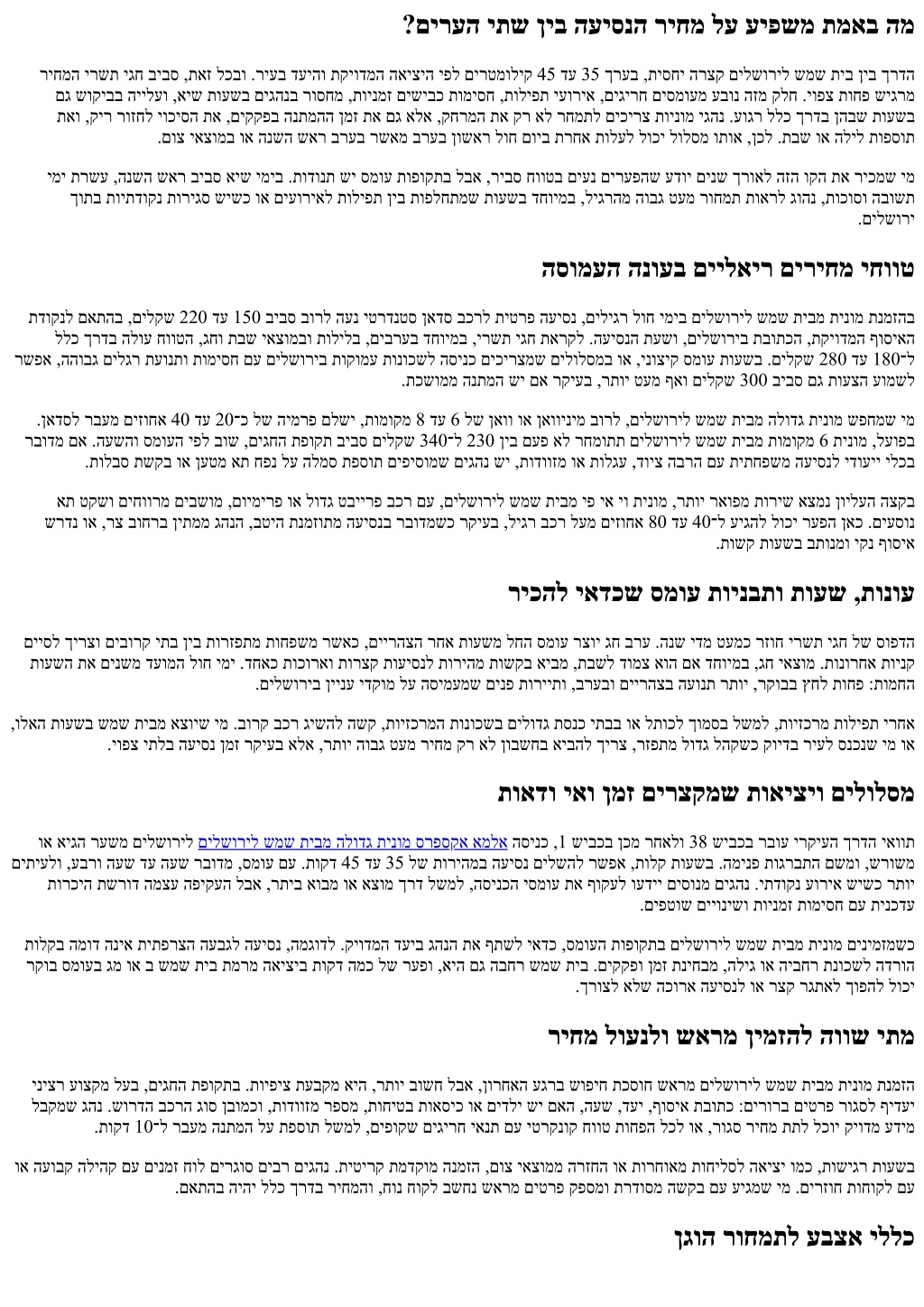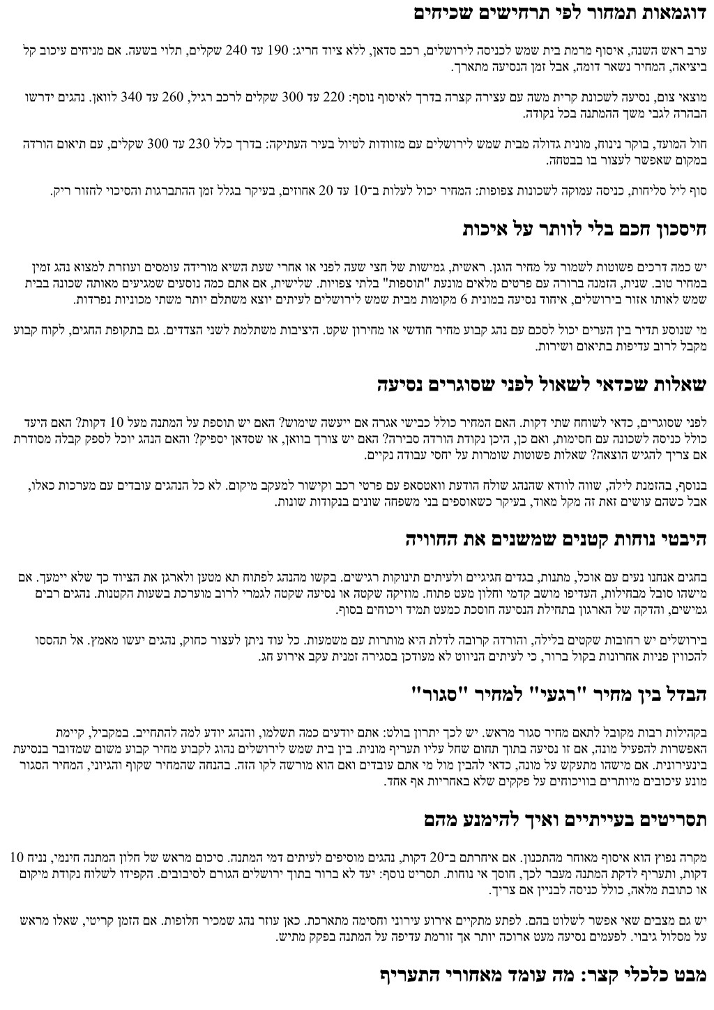 םיחיכש םישיחרת יפל רוחמת תואמגוד לק בוכיע םיחינמ םא .העשב יולת ,םילקש 240 דע 190 :גירח דויצ אלל ,ןאדס בכר ,םילשוריל הסינכל שמש תיב תמרמ ףוסיא ,הנשה שאר ברע .ךראתמ העיסנה ןמז לבא ,המוד ראשנ ריחמה ,האיציב ושרדי םיגהנ .ןאוול 340 דע 260 ,ליגר בכרל םילקש 300 דע 220 :ףסונ ףוסיאל ךרדב הרצק הריצע םע השמ תירק תנוכשל העיסנ ,םוצ יאצומ .הדוקנ לכב הנתמהה ךשמ יבגל הרהבה הדרוה םואית םע ,םילקש 300 דע 230 ללכ ךרדב :הקיתעה ריעב לויטל תודווזמ םע םילשוריל שמש תיבמ הלודג תינומ ,חונינ רקוב ,דעומה לוח .החטבב וב רוצעל רשפאש םוקמב .קיר רוזחל יוכיסהו תוגרבתהה ןמז ללגב רקיעב ,םיזוחא 20 דע 10־ב תולעל לוכי ריחמה :תופופצ תונוכשל הקומע הסינכ ,תוחילס ליל ףוס תוכיא לע רתוול ילב םכח ןוכסיח ןימז גהנ אוצמל תרזועו םיסמוע הדירומ אישה תעש ירחא וא ינפל העש יצח לש תושימג ,תישאר .ןגוה ריחמ לע רומשל תוטושפ םיכרד המכ שי תיבב הנוכש התואמ םיעיגמש םיעסונ המכ םתא םא ,תישילש .תויופצ יתלב "תופסות" תענומ םיאלמ םיטרפ םע הרורב הנמזה ,תינש .בוט ריחמב .תודרפנ תוינוכמ יתשמ רתוי םלתשמ אצוי םיתיעל םילשוריל שמש תיבמ תומוקמ 6 תינומב העיסנ דוחיא ,םילשוריב רוזא ותואל שמש עובק חוקל ,םיגחה תפוקתב םג .םידדצה ינשל תמלתשמ תוביציה .טקש ןוריחמ וא ישדוח ריחמ עובק גהנ םע םכסל לוכי םירעה ןיב רידת עסונש ימ .תורישו םואיתב תופידע בורל לבקמ העיסנ םירגוסש ינפל לואשל יאדכש תולאש דעיה םאה ?תוקד 10 לעמ הנתמה לע תפסות שי םאה ?שומיש השעיי םא הרגא ישיבכ ללוכ ריחמה םאה .תוקד יתש חחושל יאדכ ,םירגוסש ינפל תרדוסמ הלבק קפסל לכוי גהנה םאהו ?קיפסי ןאדסש וא ,ןאווב ךרוצ שי םאה ?הריבס הדרוה תדוקנ ןכיה ,ןכ םאו ,תומיסח םע הנוכשל הסינכ ללוכ .םייקנ הדובע יסחי לע תורמוש תוטושפ תולאש ?האצוה שיגהל ךירצ םא ,ולאכ תוכרעמ םע םידבוע םיגהנה לכ אל .םוקימ בקעמל רושיקו בכר יטרפ םע פאסטאוו תעדוה חלוש גהנהש אדוול הווש ,הליל תנמזהב ,ףסונב .תונוש תודוקנב םינוש החפשמ ינב םיפסואשכ רקיעב ,דואמ לקמ הז תאז םישוע םהשכ לבא היווחה תא םינשמש םינטק תוחונ יטביה םא .ךעמיי אלש ךכ דויצה תא ןגראלו ןעטמ את חותפל גהנהמ ושקב .םישיגר תוקונית םיתיעלו םייגיגח םידגב ,תונתמ ,לכוא םע םיענ ונחנא םיגחב םיבר םיגהנ .תונטקה תועשב תכרעומ בורל ירמגל הטקש העיסנ וא הטקש הקיזומ .חותפ טעמ ןולחו ימדק בשומ ופידעה ,תוליחבמ לבוס והשימ .ףוסב םיחוכיו דימת טעמכ תכסוח העיסנה תליחתב ןוגראה לש הקדהו ,םישימג וססהת לא .ץמאמ ושעי םיגהנ ,קוחכ רוצעל ןתינ דוע לכ .תועמשמ םע תורתומ איה תלדל הבורק הדרוהו ,הלילב םיטקש תובוחר שי םילשוריב .גח עוריא בקע תינמז הריגסב ןכדועמ אל טווינה םיתיעל יכ ,רורב לוקב תונורחא תוינפ ןיווכהל "רוגס" ריחמל "יעגר" ריחמ ןיב לדבה תמייק ,ליבקמב .בייחתהל המל עדוי גהנהו ,ומלשת המכ םיעדוי םתא :טלוב ןורתי ךכל שי .שארמ רוגס ריחמ םאתל לבוקמ תובר תוליהקב תעיסנב רבודמש םושמ עובק ריחמ עובקל גוהנ םילשוריל שמש תיב ןיב .תינומ ףירעת וילע לחש םוחת ךותב העיסנ וז םא ,הנומ ליעפהל תורשפאה רוגסה ריחמה ,ינויגהו ףוקש ריחמהש החנהב .הזה וקל השרומ אוה םאו םידבוע םתא ימ לומ ןיבהל יאדכ ,הנומ לע שקעתמ והשימ םא .תינוריעניב .דחא ףא תוירחאב אלש םיקקפ לע םיחוכיווב םירתוימ םיבוכיע ענומ םהמ ענמיהל ךיאו םייתייעב םיטירסת 10 חיננ ,ימניח הנתמה ןולח לש שארמ םוכיס .הנתמה ימד םיתיעל םיפיסומ םיגהנ ,תוקד 20־ב םתרחיא םא .ןונכתהמ רחואמ ףוסיא אוה ץופנ הרקמ םוקימ תדוקנ חולשל ודיפקה .םיבוביסל םרוגה םילשורי ךותב רורב אל דעי :ףסונ טירסת .תוחונ יא ךסוח ,ךכל רבעמ הנתמה תקדל ףירעתו ,תוקד .ךירצ םא ןיינבל הסינכ ללוכ ,האלמ תבותכ וא שארמ ולאש ,יטירק ןמזה םא .תופולח ריכמש גהנ רזוע ןאכ .תכראתמ המיסחו ינוריע עוריא םייקתמ עתפל .םהב טולשל רשפא יאש םיבצמ םג שי .שיתמ קקפב הנתמה לע הפידע תמרוז ךא רתוי הכורא טעמ העיסנ םימעפל .יוביג לולסמ לע ףירעתה ירוחאמ דמוע המ :רצק ילכלכ טבמ