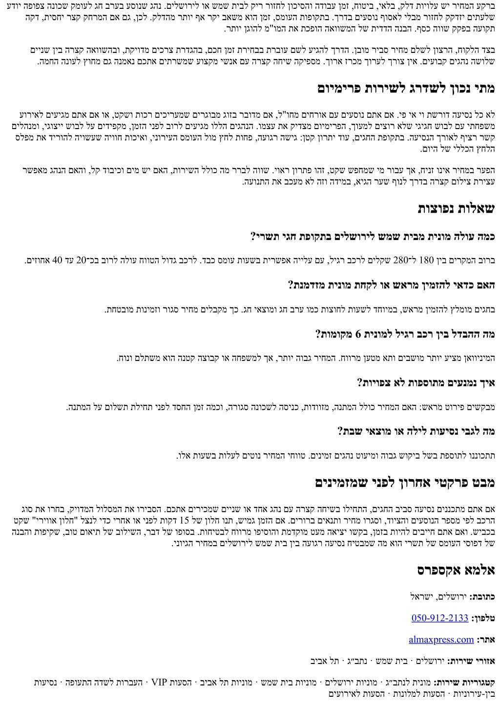 ירבוד םייעוצקמ םיגהנ ,24/7 תונימז .ביבא לתו ג״בתנ ,שמש תיב ,םילשוריב VIP תועסהו תוינומ יתוריש – סרפסקא אמלא :(Blurb) רואית תונולמל תועסה ,תוינוריע-ןיב תועיסנ ,ונממו ג״בתנל תורבעהב תוחמתה .םיקסע ישנאו םיריית ,תוחפשמל םיחוורמו םישידח םיבכרו ,תילגנא .ןמזב קיודמו חוטב ,ןימא תוריש החיטבמ שארמ הנמזה .ץראה לכב םייטרפ םירויסו ,םיעוריאלו Almaxpress Address: Jerusalem, Israel Phone:+972 50-912-2133 Website:almaxpress.com Service Areas: Jerusalem · Beit Shemesh · Ben Gurion Airport · Tel Aviv Service Categories: Taxi to Ben Gurion Airport · Jerusalem Taxi · Beit Shemesh Taxi · Tel Aviv Taxi · VIP Transfers · Airport Transfers · Intercity Rides · Hotel Transfers · Event Transfers Blurb: ALMA Express provides premium taxi and VIP transfer services in Jerusalem, Beit Shemesh, Ben Gurion Airport, and Tel Aviv. Available 24/7 with professional English-speaking drivers and modern, spacious vehicles for families, tourists, and business travelers. We specialize in airport transfers, intercity rides, hotel and event transport, and private tours across Israel. Book in advance for reliable, safe, on-time service.