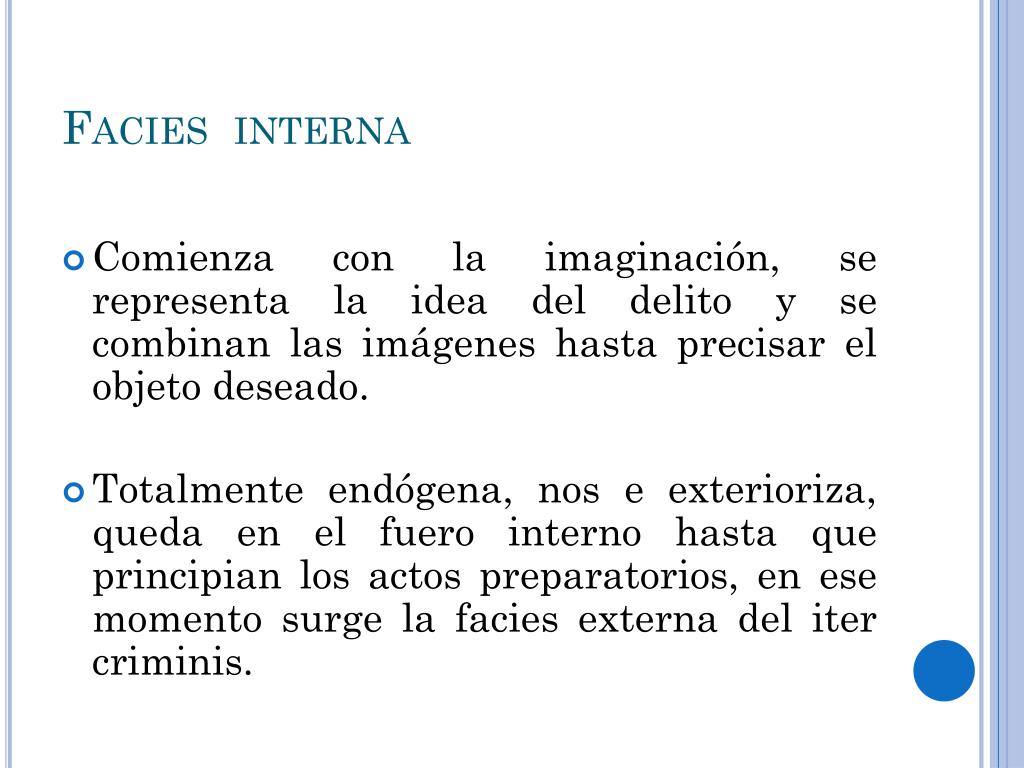 Facies interna • Comienza con la imaginación, se representa la idea del delito y se combinan las imágenes hasta precisar el objeto deseado. • Totalmente endógena, nos e exterioriza, queda en el fuero interno hasta que principian los actos preparatorios, en ese momento surge la facies externa del itercriminis.