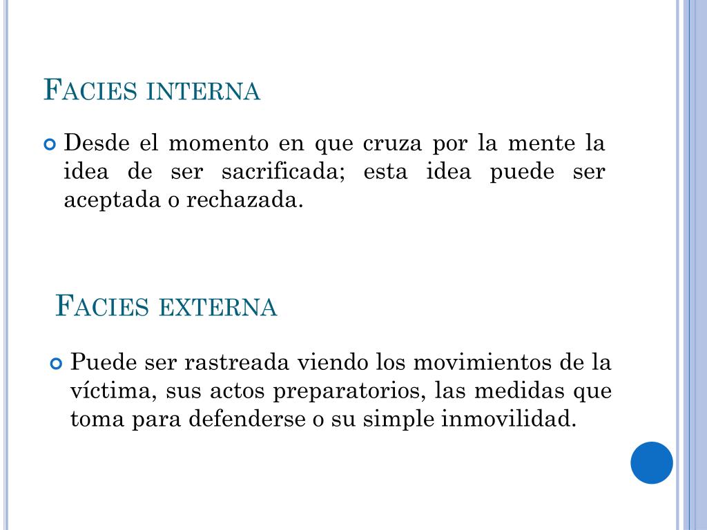 Facies interna • Desde el momento en que cruza por la mente la idea de ser sacrificada; esta idea puede ser aceptada o rechazada. Facies externa • Puede ser rastreada viendo los movimientos de la víctima, sus actos preparatorios, las medidas que toma para defenderse o su simple inmovilidad.