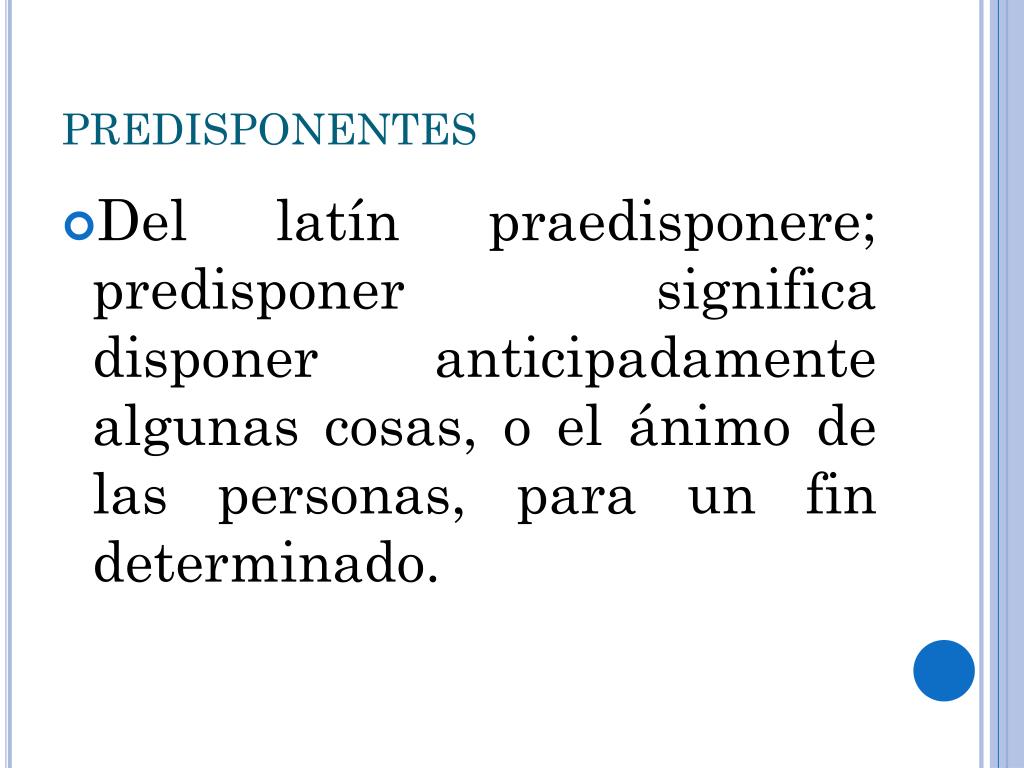 PREDISPONENTES • Del latín praedisponere; predisponer significa disponer anticipadamente algunas cosas, o el ánimo de las personas, para un fin determinado.