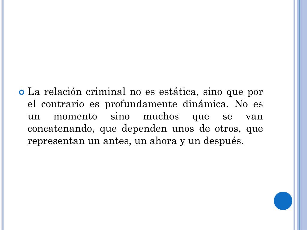 La relación criminal no es estática, sino que por el contrario es profundamente dinámica. No es un momento sino muchos que se van concatenando, que dependen unos de otros, que representan un antes, un ahora y un después.