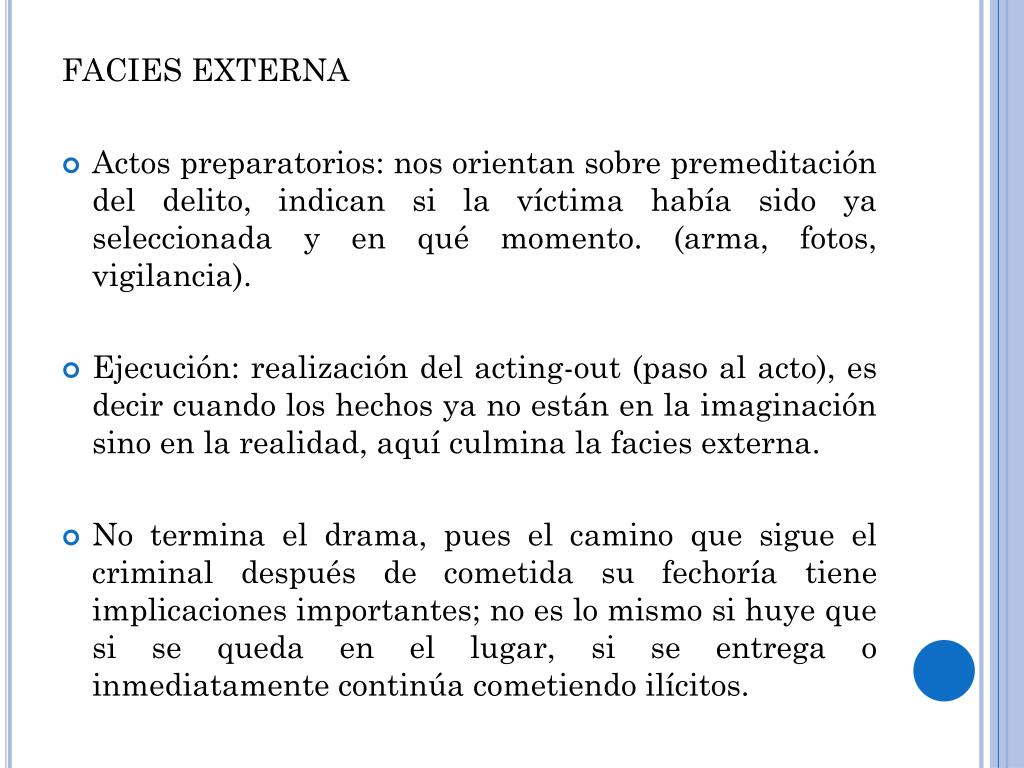 FACIES EXTERNA • Actos preparatorios: nos orientan sobre premeditación del delito, indican si la víctima había sido ya seleccionada y en qué momento. (arma, fotos, vigilancia). • Ejecución: realización del acting-out (paso al acto), es decir cuando los hechos ya no están en la imaginación sino en la realidad, aquí culmina la facies externa. • No termina el drama, pues el camino que sigue el criminal después de cometida su fechoría tiene implicaciones importantes; no es lo mismo si huye que si se queda en el lugar, si se entrega o inmediatamente continúa cometiendo ilícitos.