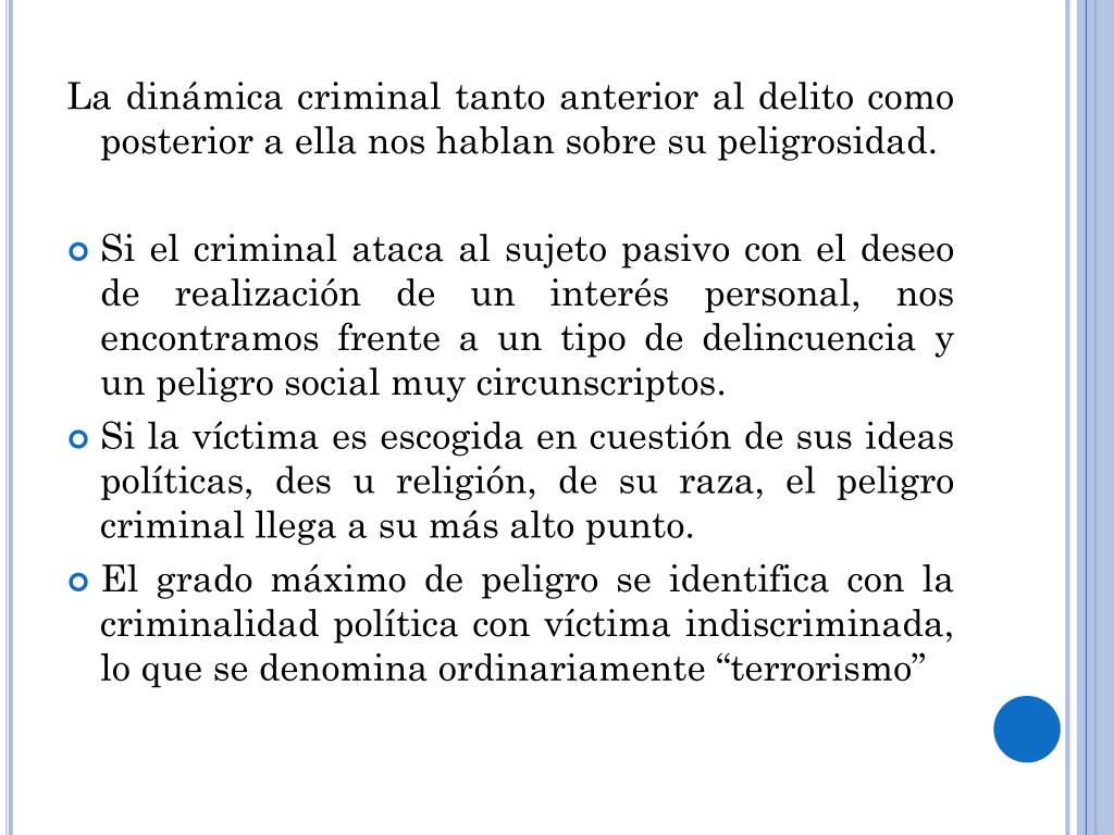 La dinámica criminal tanto anterior al delito como posterior a ella nos hablan sobre su peligrosidad. • Si el criminal ataca al sujeto pasivo con el deseo de realización de un interés personal, nos encontramos frente a un tipo de delincuencia y un peligro social muy circunscriptos. • Si la víctima es escogida en cuestión de sus ideas políticas, des u religión, de su raza, el peligro criminal llega a su más alto punto. • El grado máximo de peligro se identifica con la criminalidad política con víctima indiscriminada, lo que se denomina ordinariamente “terrorismo”