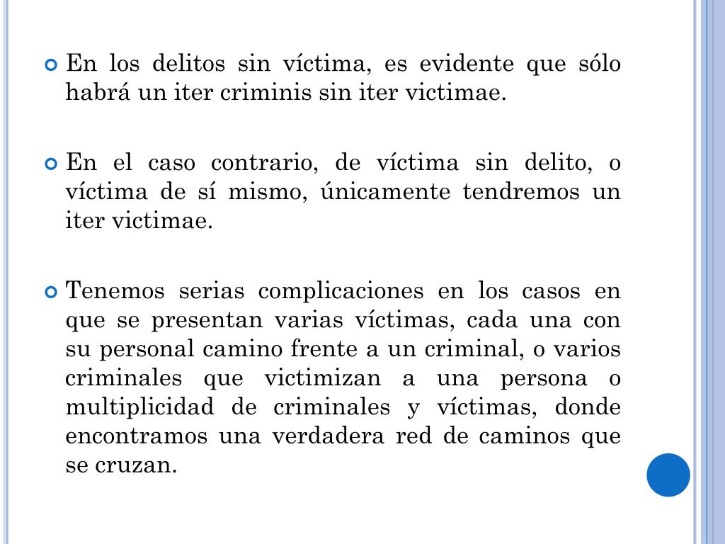 En los delitos sin víctima, es evidente que sólo habrá un itercriminis sin itervictimae. • En el caso contrario, de víctima sin delito, o víctima de sí mismo, únicamente tendremos un itervictimae. • Tenemos serias complicaciones en los casos en que se presentan varias víctimas, cada una con su personal camino frente a un criminal, o varios criminales que victimizan a una persona o multiplicidad de criminales y víctimas, donde encontramos una verdadera red de caminos que se cruzan.