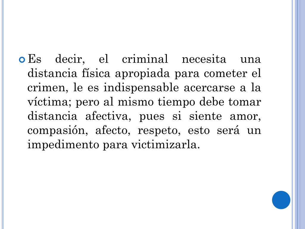 Es decir, el criminal necesita una distancia física apropiada para cometer el crimen, le es indispensable acercarse a la víctima; pero al mismo tiempo debe tomar distancia afectiva, pues si siente amor, compasión, afecto, respeto, esto será un impedimento para victimizarla.