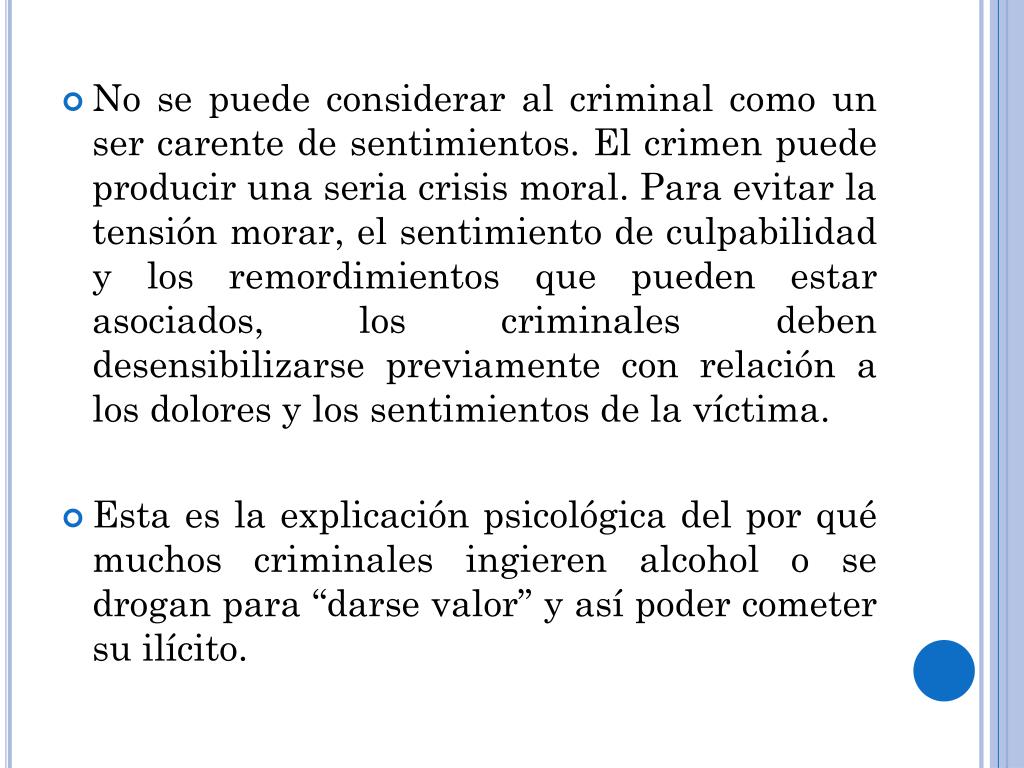 No se puede considerar al criminal como un ser carente de sentimientos. El crimen puede producir una seria crisis moral. Para evitar la tensión morar, el sentimiento de culpabilidad y los remordimientos que pueden estar asociados, los criminales deben desensibilizarse previamente con relación a los dolores y los sentimientos de la víctima. • Esta es la explicación psicológica del por qué muchos criminales ingieren alcohol o se drogan para “darse valor” y así poder cometer su ilícito.