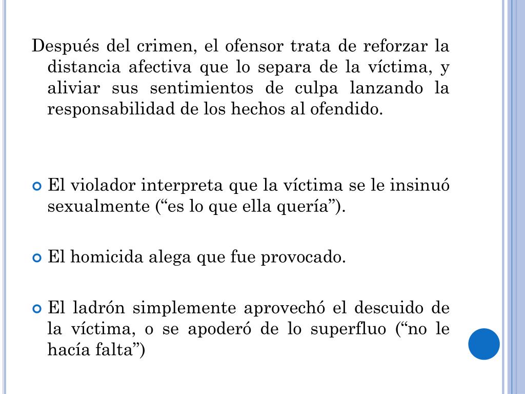 Después del crimen, el ofensor trata de reforzar la distancia afectiva que lo separa de la víctima, y aliviar sus sentimientos de culpa lanzando la responsabilidad de los hechos al ofendido. • El violador interpreta que la víctima se le insinuó sexualmente (“es lo que ella quería”). • El homicida alega que fue provocado. • El ladrón simplemente aprovechó el descuido de la víctima, o se apoderó de lo superfluo (“no le hacía falta”)