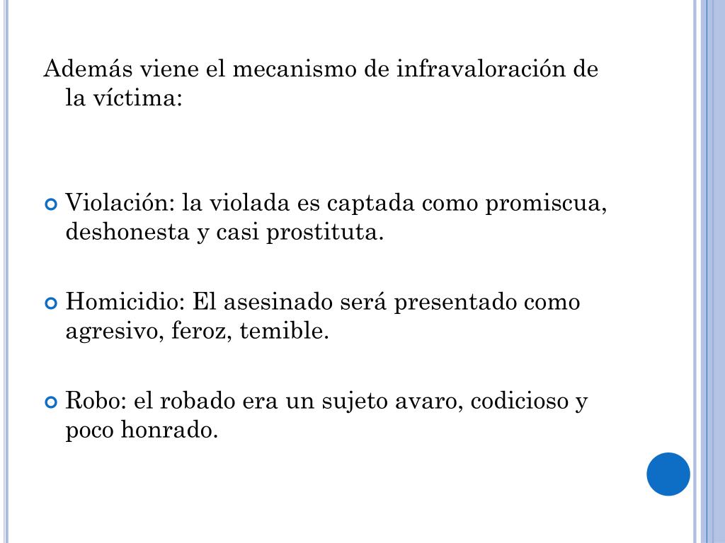 Además viene el mecanismo de infravaloración de la víctima: • Violación: la violada es captada como promiscua, deshonesta y casi prostituta. • Homicidio: El asesinado será presentado como agresivo, feroz, temible. • Robo: el robado era un sujeto avaro, codicioso y poco honrado.