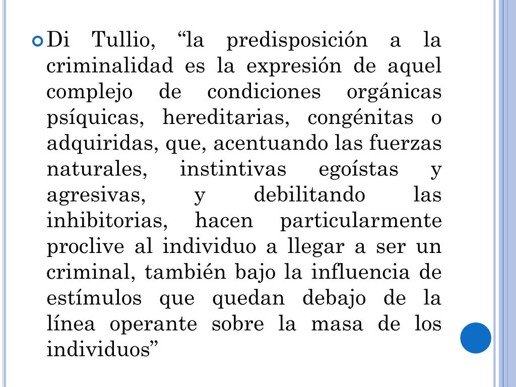 Di Tullio, “la predisposición a la criminalidad es la expresión de aquel complejo de condiciones orgánicas psíquicas, hereditarias, congénitas o adquiridas, que, acentuando las fuerzas naturales, instintivas egoístas y agresivas, y debilitando las inhibitorias, hacen particularmente proclive al individuo a llegar a ser un criminal, también bajo la influencia de estímulos que quedan debajo de la línea operante sobre la masa de los individuos”
