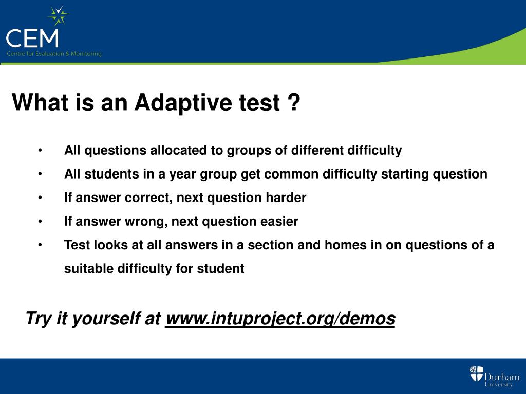 What is an Adaptive test ? • All questions allocated to groups of different difficulty • All students in a year group get common difficulty starting question • If answer correct, next question harder • If answer wrong, next question easier • Test looks at all answers in a section and homes in on questions of a suitable difficulty for student Try it yourself at www.intuproject.org/demos
