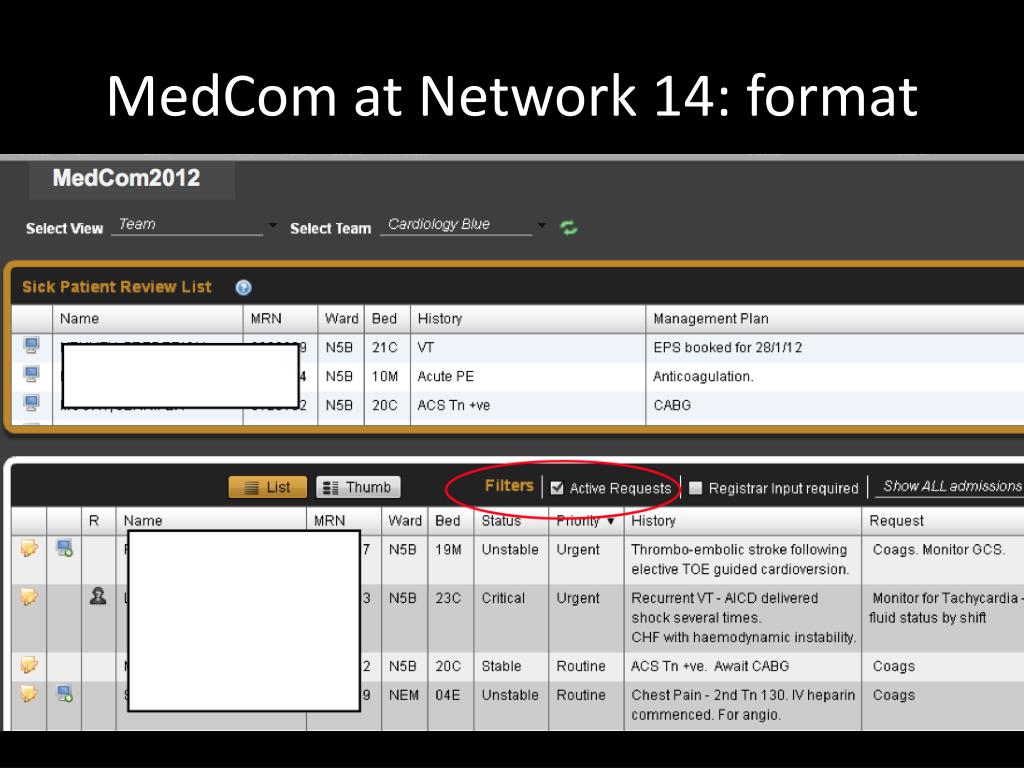 WAND / MEDCOM Case Study: JMO experience in a Network 14 hospital • Official handover requirement: WAND (for nurse/nurse) and MedCom (for Dr/Dr) • MedCom is currently being trialled • Job management assistance as organises entries ward by ward, can ‘flag’ a sick review or timed ward task