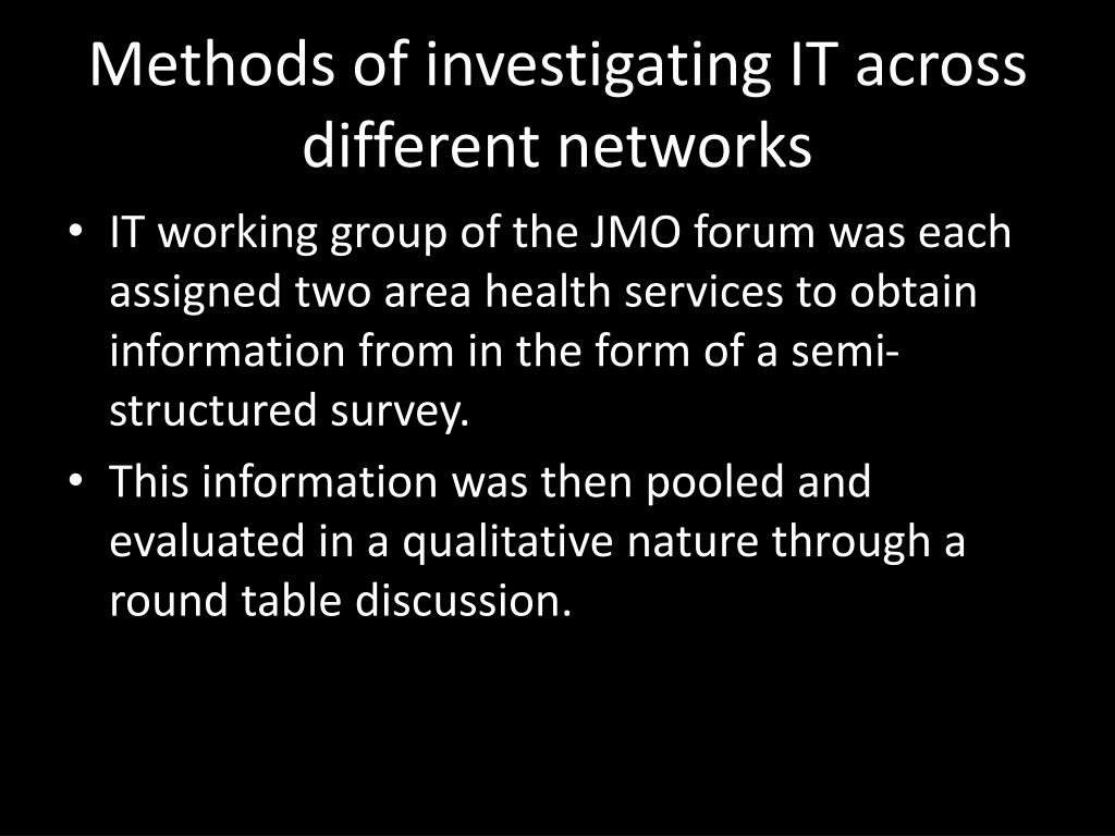 Methods of investigating IT across different networks • IT working group of the JMO forum was each assigned two area health services to obtain information from in the form of a semi-structured survey. • This information was then pooled and evaluated in a qualitative nature through a round table discussion.
