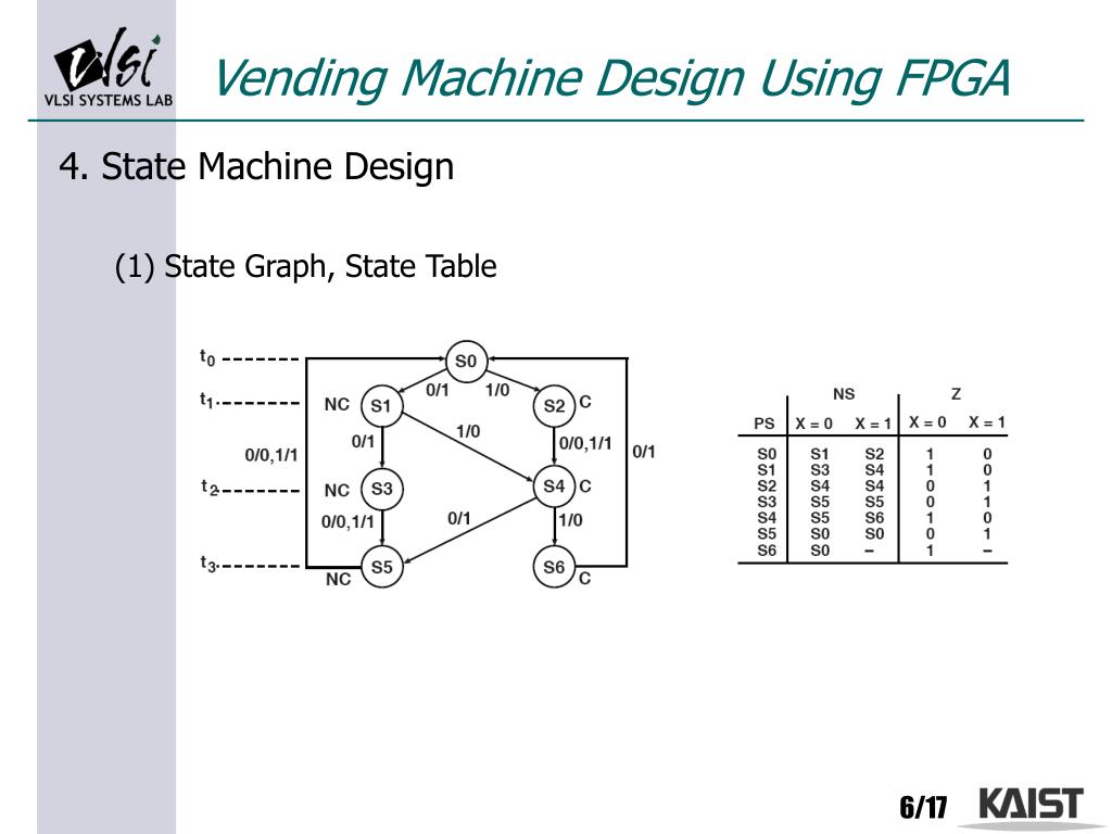 Lecture 6 Coffee Vending Machine using FPGA. 2007/10/12 Prof. C.M. Kyung. Vending Machine Design Using FPGA. 1. GOAL is ~ (1) Understanding of FSM and Its Sequential Behaviors (2) Understanding of the Design Procedure for FSM (3) Design of the FSM for Vending Machine and Implementation.