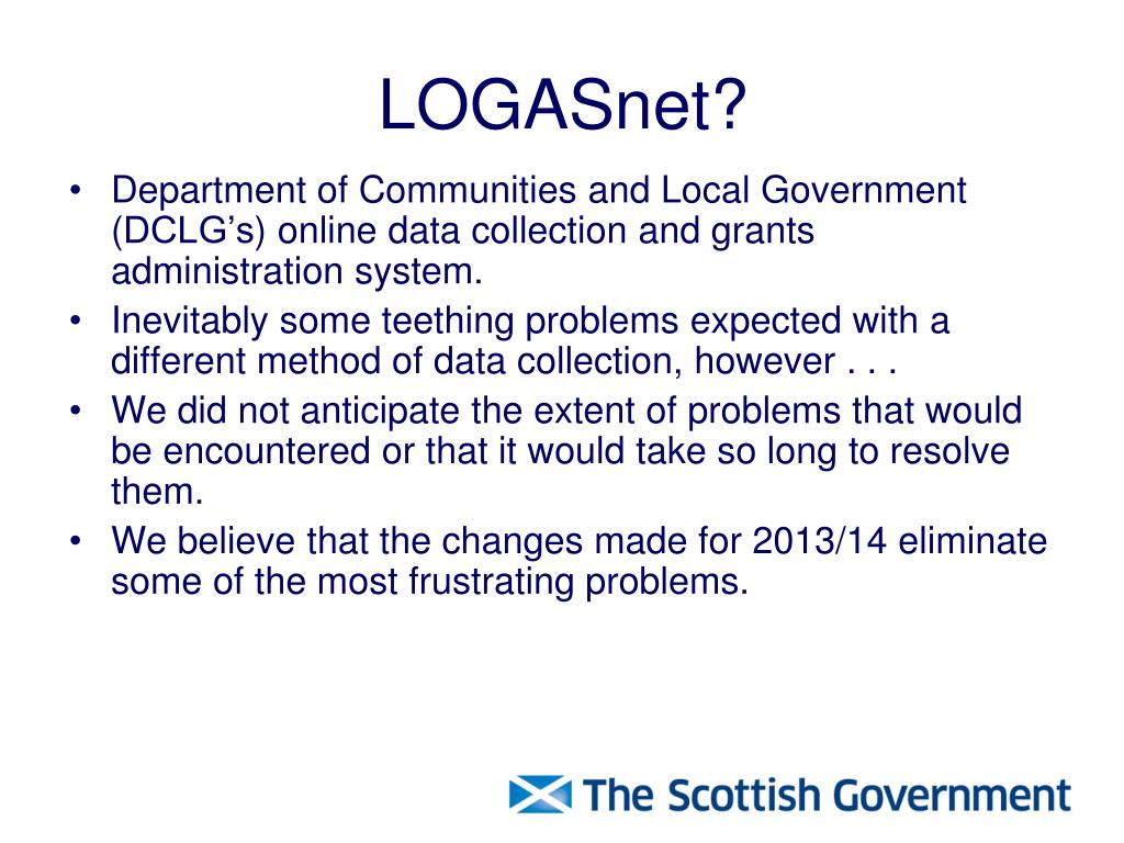 LOGASnet? • Department of Communities and Local Government (DCLG’s) online data collection and grants administration system. • Inevitably some teething problems expected with a different method of data collection, however . . . • We did not anticipate the extent of problems that would be encountered or that it would take so long to resolve them. • We believe that the changes made for 2013/14 eliminate some of the most frustrating problems.