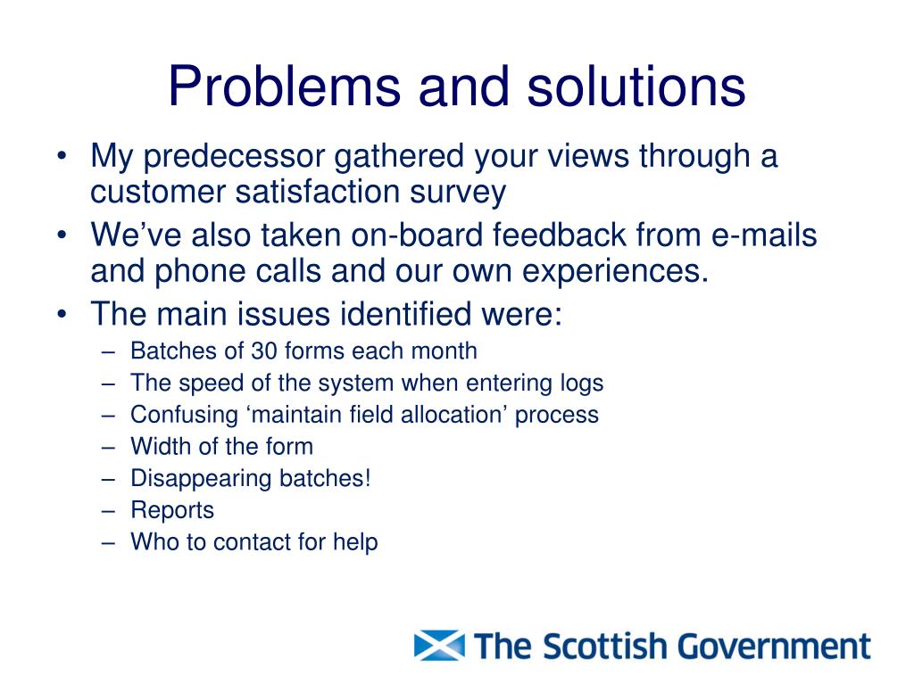Problems and solutions • My predecessor gathered your views through a customer satisfaction survey • We’ve also taken on-board feedback from e-mails and phone calls and our own experiences. • The main issues identified were: • Batches of 30 forms each month • The speed of the system when entering logs • Confusing ‘maintain field allocation’ process • Width of the form • Disappearing batches! • Reports • Who to contact for help