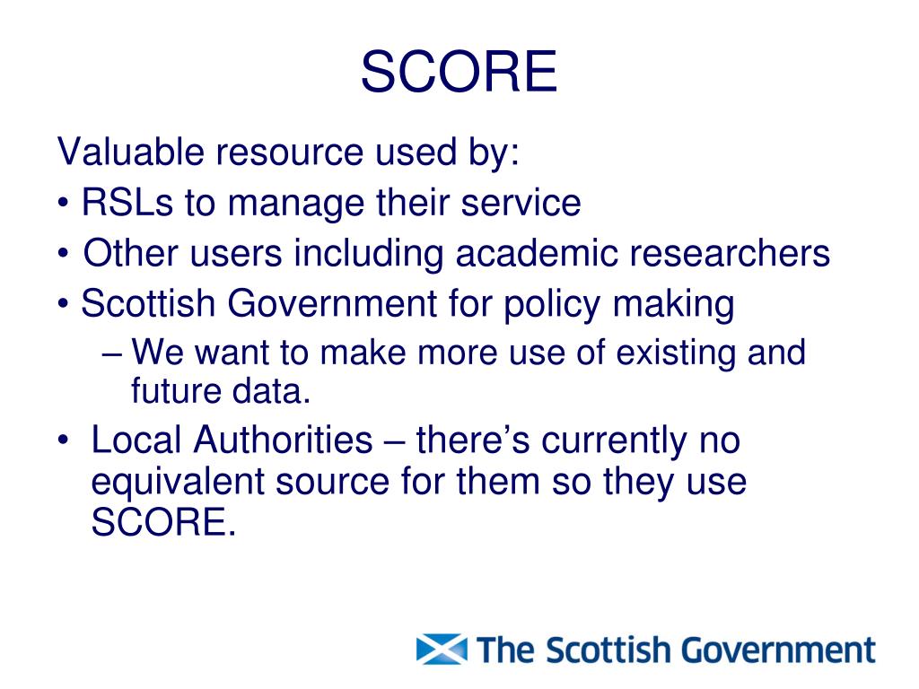 SCORE Valuable resource used by: • RSLs to manage their service • Other users including academic researchers • Scottish Government for policy making • We want to make more use of existing and future data. • Local Authorities – there’s currently no equivalent source for them so they use SCORE.