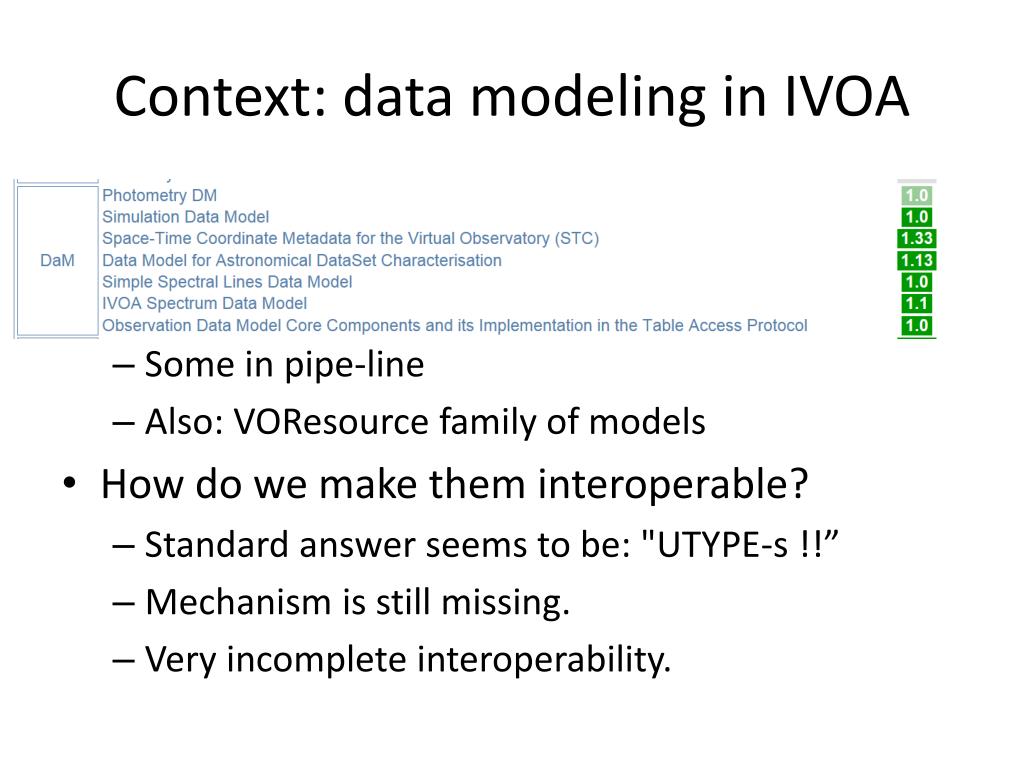 Context: data modeling in IVOA • Some in pipe-line • Also: VOResource family of models • How do we make them interoperable? • Standard answer seems to be: "UTYPE-s !!” • Mechanism is still missing. • Very incomplete interoperability.