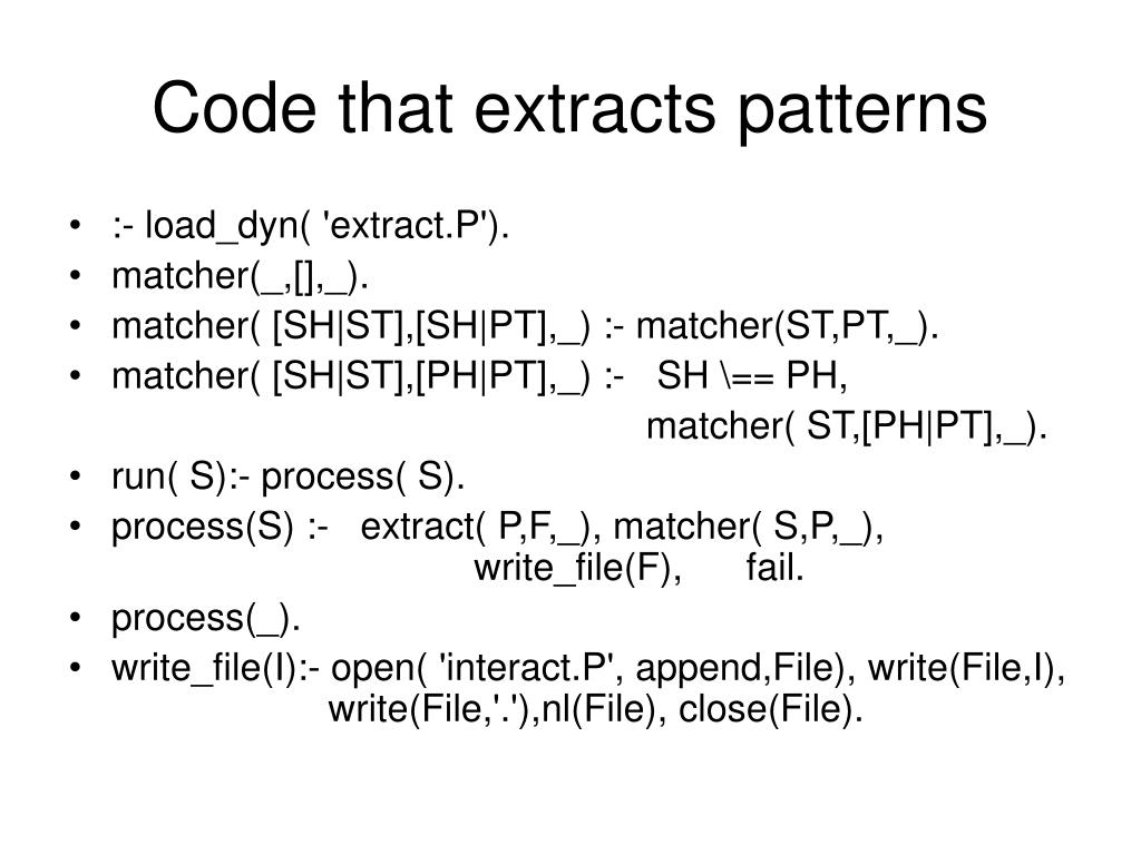 Code that extracts patterns • :- load_dyn( 'extract.P'). • matcher(_,[],_). • matcher( [SH|ST],[SH|PT],_) :- matcher(ST,PT,_). • matcher( [SH|ST],[PH|PT],_) :- SH \== PH, matcher( ST,[PH|PT],_). • run( S):- process( S). • process(S) :- extract( P,F,_), matcher( S,P,_), write_file(F), fail. • process(_). • write_file(I):- open( 'interact.P', append,File), write(File,I), write(File,'.'),nl(File), close(File).
