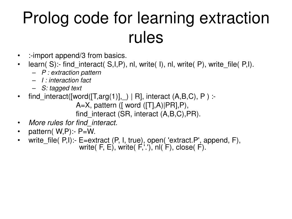 Prolog code for learning extraction rules • :-import append/3 from basics. • learn( S):- find_interact( S,I,P), nl, write( I), nl, write( P), write_file( P,I). • P : extraction pattern • I : interaction fact • S: tagged text • find_interact([word([T,arg(1)],_) | R], interact (A,B,C), P ) :- A=X, pattern ([ word ([T],A)|PR],P), find_interact (SR, interact (A,B,C),PR). • More rules for find_interact. • pattern( W,P):- P=W. • write_file( P,I):- E=extract (P, I, true), open( 'extract.P', append, F), write( F, E), write( F,'.'), nl( F), close( F).