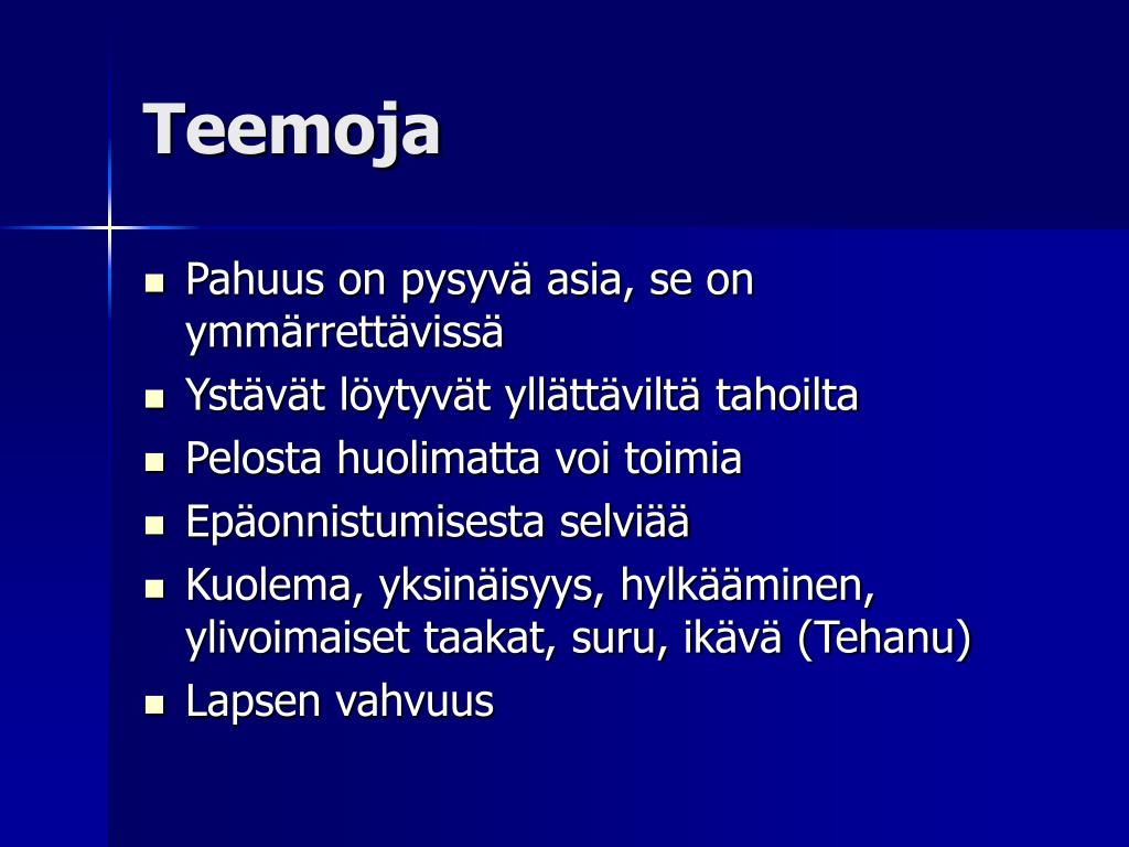 Teemoja • Pahuus on pysyvä asia, se on ymmärrettävissä • Ystävät löytyvät yllättäviltä tahoilta • Pelosta huolimatta voi toimia • Epäonnistumisesta selviää • Kuolema, yksinäisyys, hylkääminen, ylivoimaiset taakat, suru, ikävä (Tehanu) • Lapsen vahvuus
