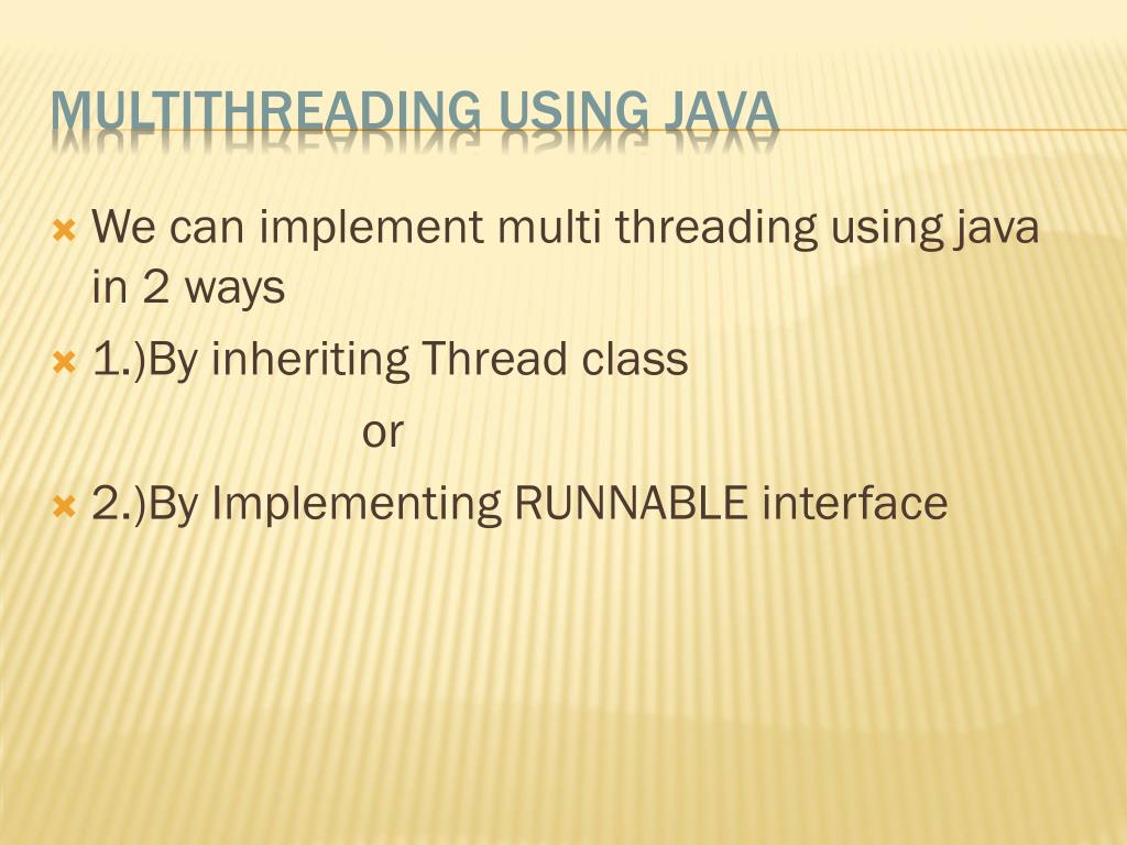 We can implement multi threading using java in 2 ways 1.)By inheriting Thread class or 2.)By Implementing RUNNABLE interface Multithreading using java