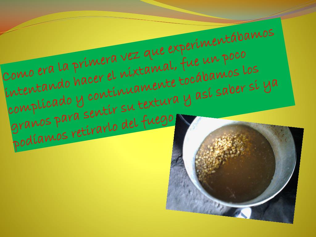 Como era la primera vez que experimentábamos intentando hacer el nixtamal, fue un poco complicado y continuamente tocábamos los granos para sentir su textura y así saber si ya podíamos retirarlo del fuego