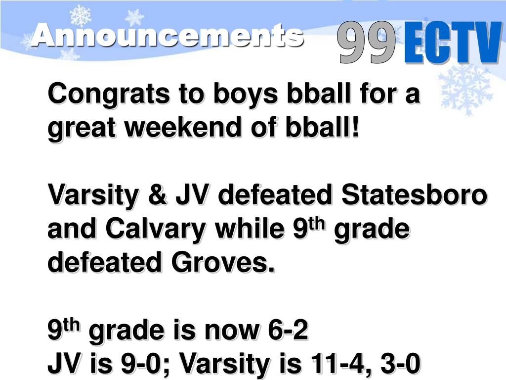 Announcements • Congrats to boys bball for a great weekend of bball! • Varsity & JV defeated Statesboro and Calvary while 9th grade defeated Groves. • 9th grade is now 6-2 • JV is 9-0; Varsity is 11-4, 3-0
