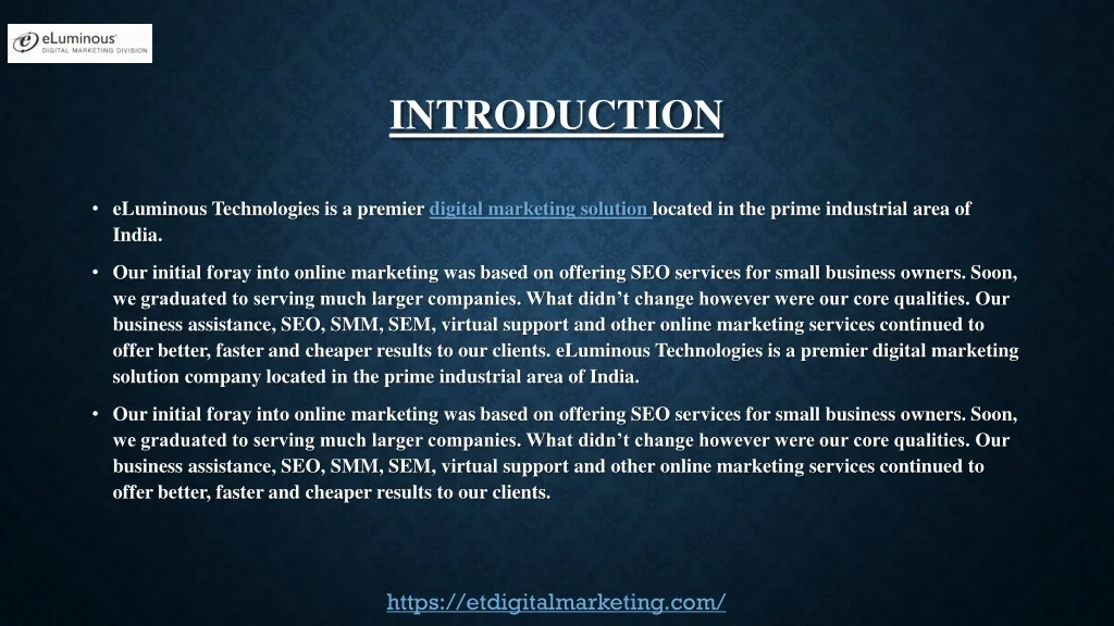 Introduction • eLuminous Technologies is a premier digital marketing solution located in the prime industrial area of India. • Our initial foray into online marketing was based on offering SEO services for small business owners. Soon, we graduated to serving much larger companies. What didn’t change however were our core qualities. Our business assistance, SEO, SMM, SEM, virtual support and other online marketing services continued to offer better, faster and cheaper results to our clients. eLuminous Technologies is a premier digital marketing solution company located in the prime industrial area of India. • Our initial foray into online marketing was based on offering SEO services for small business owners. Soon, we graduated to serving much larger companies. What didn’t change however were our core qualities. Our business assistance, SEO, SMM, SEM, virtual support and other online marketing services continued to offer better, faster and cheaper results to our clients. https://etdigitalmarketing.com/