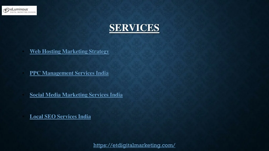 Services • Web Hosting Marketing Strategy • PPC Management Services India • Social Media Marketing Services India • Local SEO Services India https://etdigitalmarketing.com/