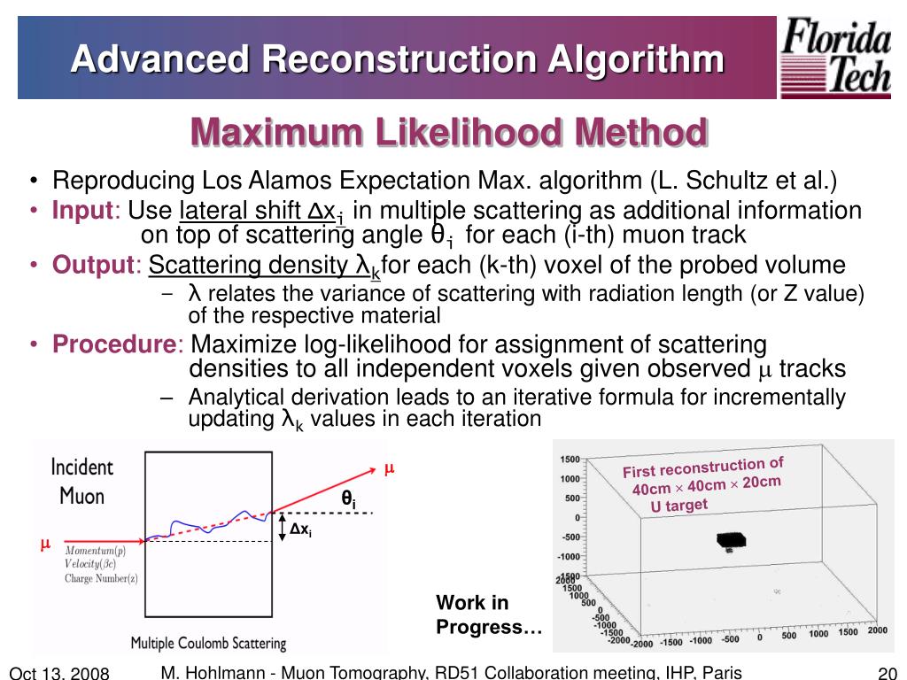 Advanced Reconstruction Algorithm Maximum Likelihood Method • Reproducing Los Alamos Expectation Max. algorithm (L. Schultz et al.) • Input: Use lateral shift Δxi in multiple scattering as additional information on top of scattering angle θi for each (i-th) muon track • Output:Scattering density λkfor each (k-th) voxel of the probed volume • λ relates the variance of scattering with radiation length (or Z value) of the respective material • Procedure: Maximize log-likelihood for assignment of scattering densities to all independent voxels given observed tracks • Analytical derivation leads to an iterative formula for incrementally updating λk values in each iteration First reconstruction of 40cm 40cm 20cm U target θi Δxi Work in Progress… M. Hohlmann - Muon Tomography, RD51 Collaboration meeting, IHP, Paris